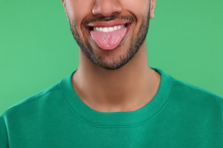 Happy man showing his tongue on green background, closeup
