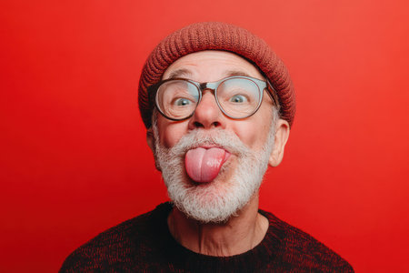 Hilarious close-up of an older man making a silly face with tongue out, captured through a fisheye lens, isolated on colorful background.