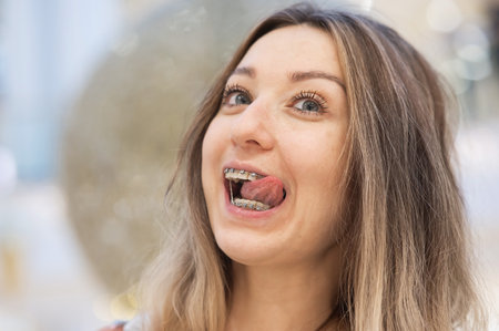 Portrait of a grimacing woman with braces on her teeth