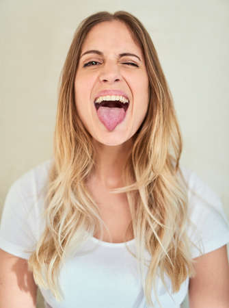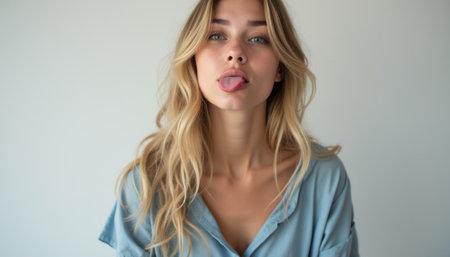 A young woman with long, wavy blonde hair playfully sticks out her tongue, exuding a carefree and fun-loving spirit. Her bright blue eyes sparkle with mischief against a soft, neutral background, capturing a moment of youthful exuberance and spontaneity.
