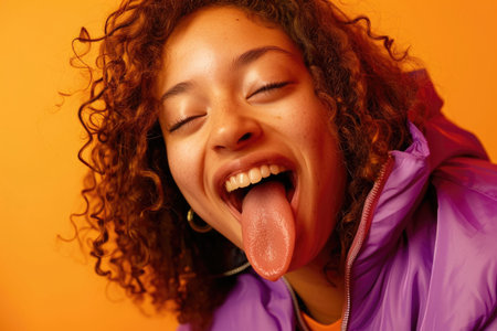 A joyful young woman expresses her carefree spirit by sticking out her tongue with a radiant smile, capturing a moment of playful energy and authentic happiness.