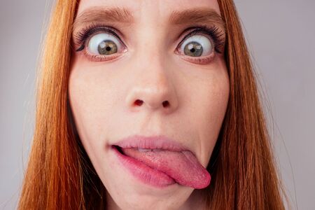 redhair ginger woman demonstrating tongue and making stupid face with crossed eyes