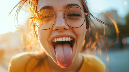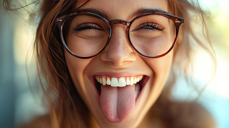 A joyful young woman shows a playful side as she dons stylish glasses and sticks out her tongue to radiate carefree happiness in natural light.