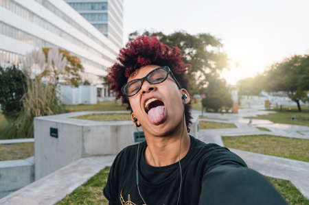 front view pretty young hispanic brunette latin woman with afro and glasses, outdoors in a city park, sticking out her tongue taking a selfie, phone perspective.