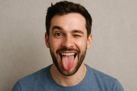 Portrait of a cheerful young man with short brown hair and beard sticking out his tongue and winking against a neutral background