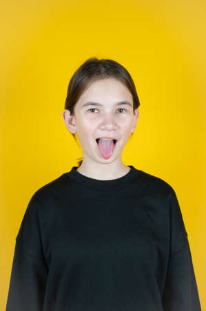 Cute Caucasian kid girl wearing black sweatshirt against yellow wall showing tongue