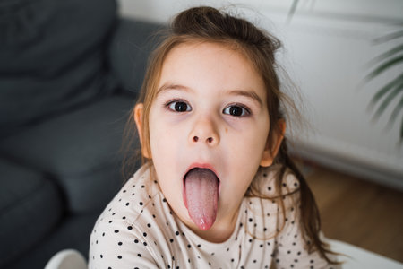 Cute little girl with long hair sticking out her tongue at home
