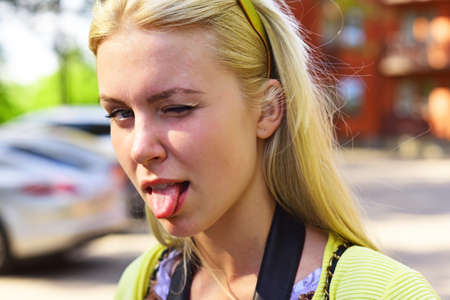 Woman emotions face. Girl shows tongue outdoor.