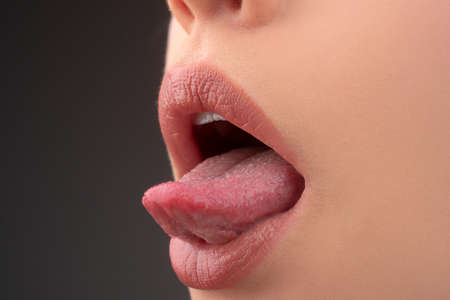Stucks out tongue. Close-up shoot of female mouth with natural lips make-up and well kept cheeks skin. Cosmetology, medicine, dentistry and beauty care, emotions and facial expression concept. Detailed.