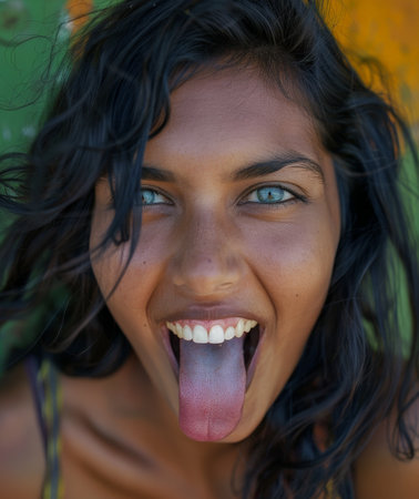 A close-up portrait of a woman joyfully sticking out her tongue, radiating happiness and confidence in natural light. Her healthy teeth enhance the cheerful vibe.