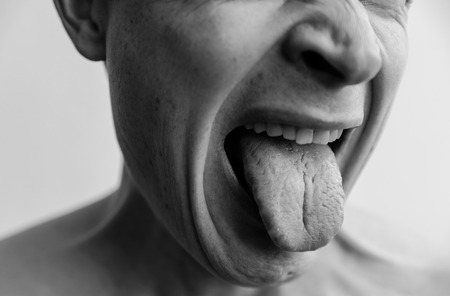 Mimicry, showing disgust . The lower part of the face of a man closeup. Black and white images