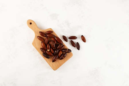 Baru seed, also known as baru nut, or chiquitania almond on wooden cutting board, top view. Trendy superfood, antioxidant, rich in: dietary fiber, omega-3, magnesium, potassium, phosphorus and zinc.