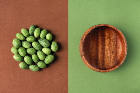 Cucamelon, round wooden plate on textured paper background. Nature, balance, geometry concept. Organic design, grassy green brown colors. Minimalistic horizontal poster. Eco tableware, plant, flat lay