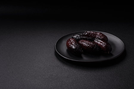 Delicious black blood sausage or black pudding with spices and herbs grilled on a black concrete background