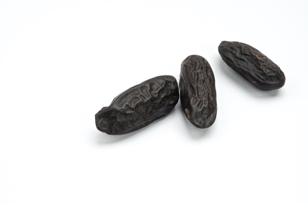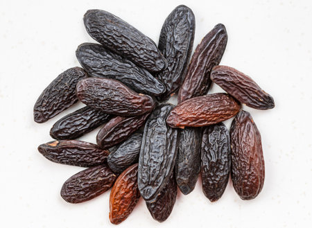 Fragrant tonka beans on white background, baking flavored ingredient (Dipteryx odorata)