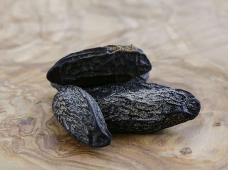 macro image of a tonka bean (Dipteryx odorata) on wood background