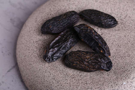 top view of pile of dried tonka beans close up on gray ceramic plate