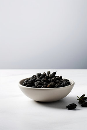 A bowl of black beans with green leaves on a table, AI