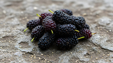 A cluster of fresh, ripe black mulberries is piled on a rough, textured stone surface. The close-up shot captures the juicy, bumpy texture of the berries, emphasizing their natural and organic appeal.