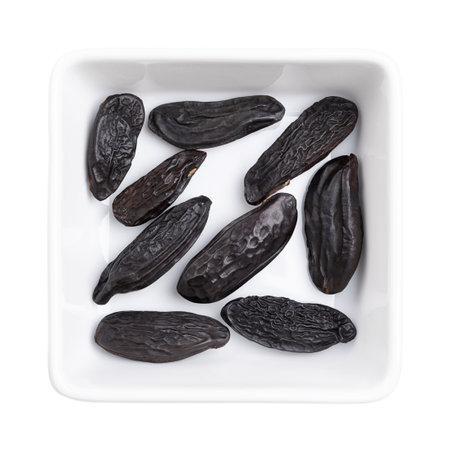 Fragrant tonka beans in small bowl on white background, baking flavored ingredient (Dipteryx odorata)