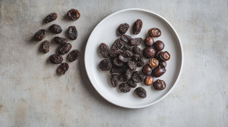 Overhead view of scattered prunes on a white background provides a clean and modern look making it suitable for health and food campaigns.