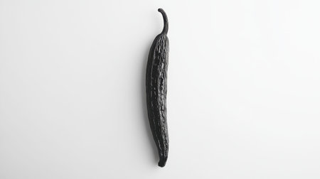 This image features a single black chili pepper against a white backdrop, highlighting its unique and glossy shape, perfect for culinary projects and food-related themes.