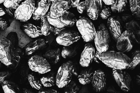 Black and white photo of dried dates. Black and white photo.