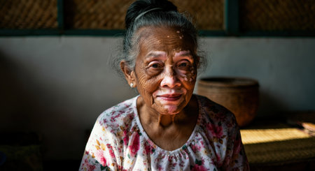 Elderly asian woman with traditional clothing in rustic interior setting