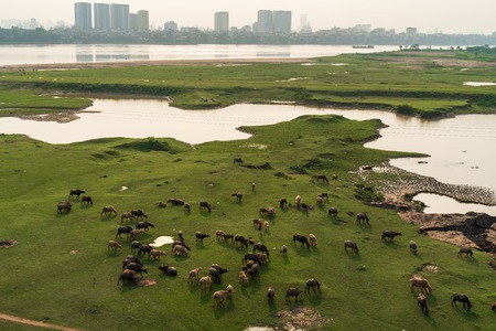 Herd of buffalo grazing next to the Red river, in Hanoi, Vietnam. Hanoi city on background