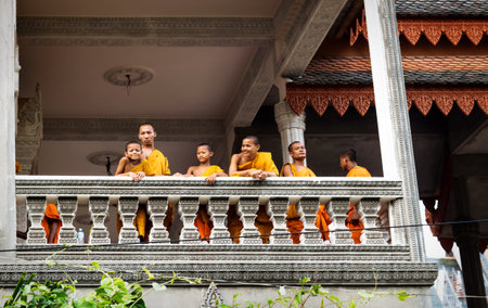 Siem Reap, Cambodia - 5 April 2013: Smiling monks on a balcony of a monastery in Siem Reap, Cambodia