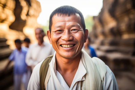 Portrait of a happy asian man in front of the temple