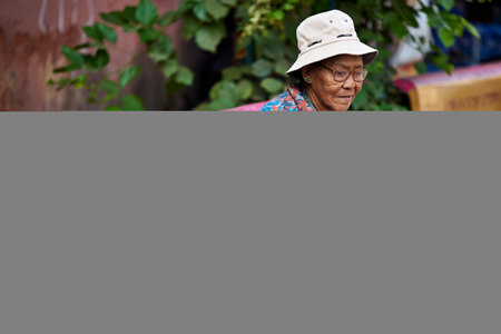 Thai old woman in traditional dress and hat sitting in the garden.
