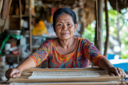 Asian craftswoman skillfully weaving placemats from sustainable bamboo in her workshop, preserving tradition and promoting eco friendly practices