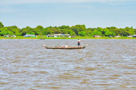 SIEMREAP, CAMBODIA - MARCH 14 2013: locals sail in wooden boats, local transport on the river and TonleSap Lake