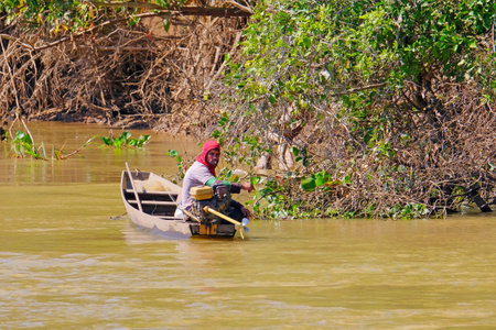 CORUMBA, MATO GROSSO, BRAZIL, JULY 23, 2018: Traditional indigenous fisherman in boat on the Rio Paraguay river, Pantanal, near Corumba, Mato Grosso Do Sul, Brazil, South America