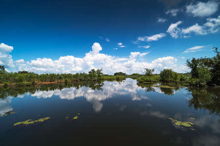 Panorama from Pantanal, Brazilian wetland region. Navigable lagoon. South America landmark