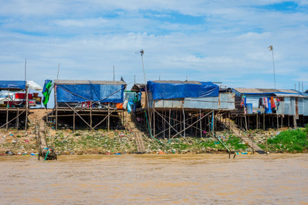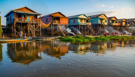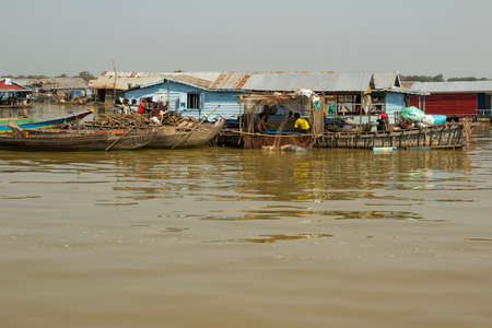 traditional settlement with wooden houses at the Tonle Sap river in Cambodia