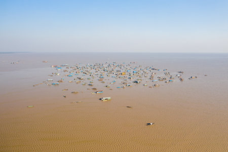 Aerial view of floating market in Tonle Sap lake, Cambodia
