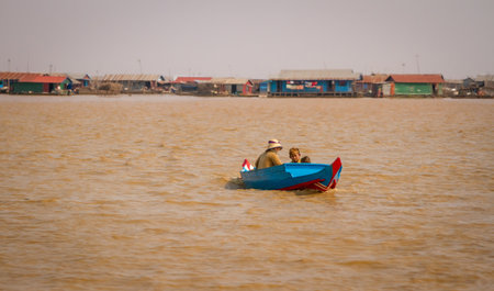 Puok, Siem Reap Province, Cambodia - 4 April 2013: Local Cambodian mother with kid rowing along Tonle Sap lake at floating village