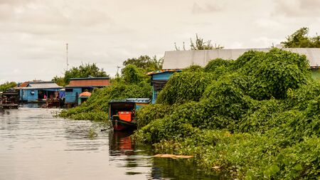 SIEM REAP, CAMBODIA - APRIL 8: Water canals with houses on the pillars towards Tonle Sap floating village. April 2017