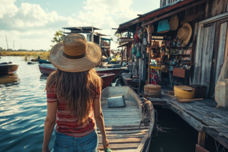 A woman strolls along a wooden path by the water, admiring handmade crafts in a riverside market.