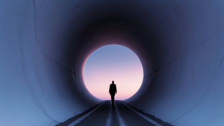 A lone figure walks towards a light at the end of a dark, curved tunnel.