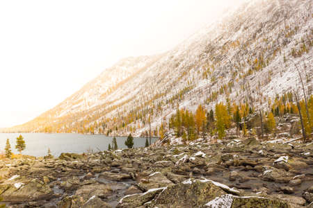Beautiful golden larches in mountains, Fall season.