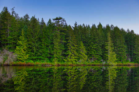 Pine trees and cloudy sky reflecting in the crystal clear water of a lake on a cloudy day in Lynn Canyon Park forest in Vancouver, Canada