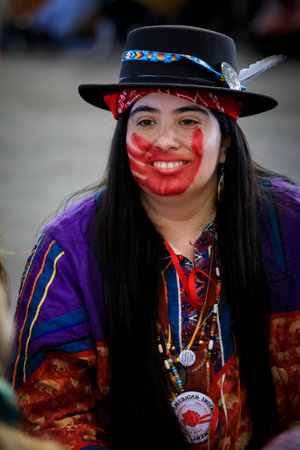 San Francisco, USA - February 08, 2020: Native American woman at Pow Wow with face paint in support for MMIW, Missing and Murdered Indigenous Women