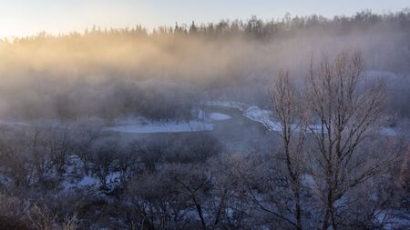 Mountain lake with rocks on the shore, winter fog over the water surface. Travel to the mountains on foot, wildlife.