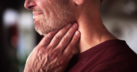 A close-up view of a man touching his throat, displaying concern and discomfort while reflecting on his health at home. Captures a moment of introspection.
