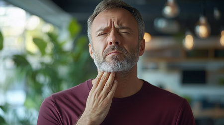a man is touching his neck with his hand, possibly experiencing a sore throat, in an indoor setting