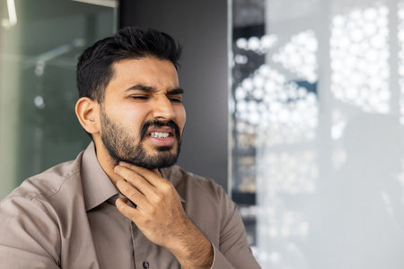 A young man displays discomfort as he touches his throat, reflecting emotions of worry or concern about his health in a modern indoor setting.