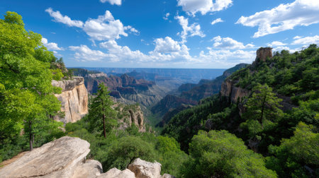 A stunning landscape of the Grand Canyon showcases lush trees and dramatic clouds against a clear blue sky. Perfect for travel and nature enthusiasts seeking breathtaking vistas.